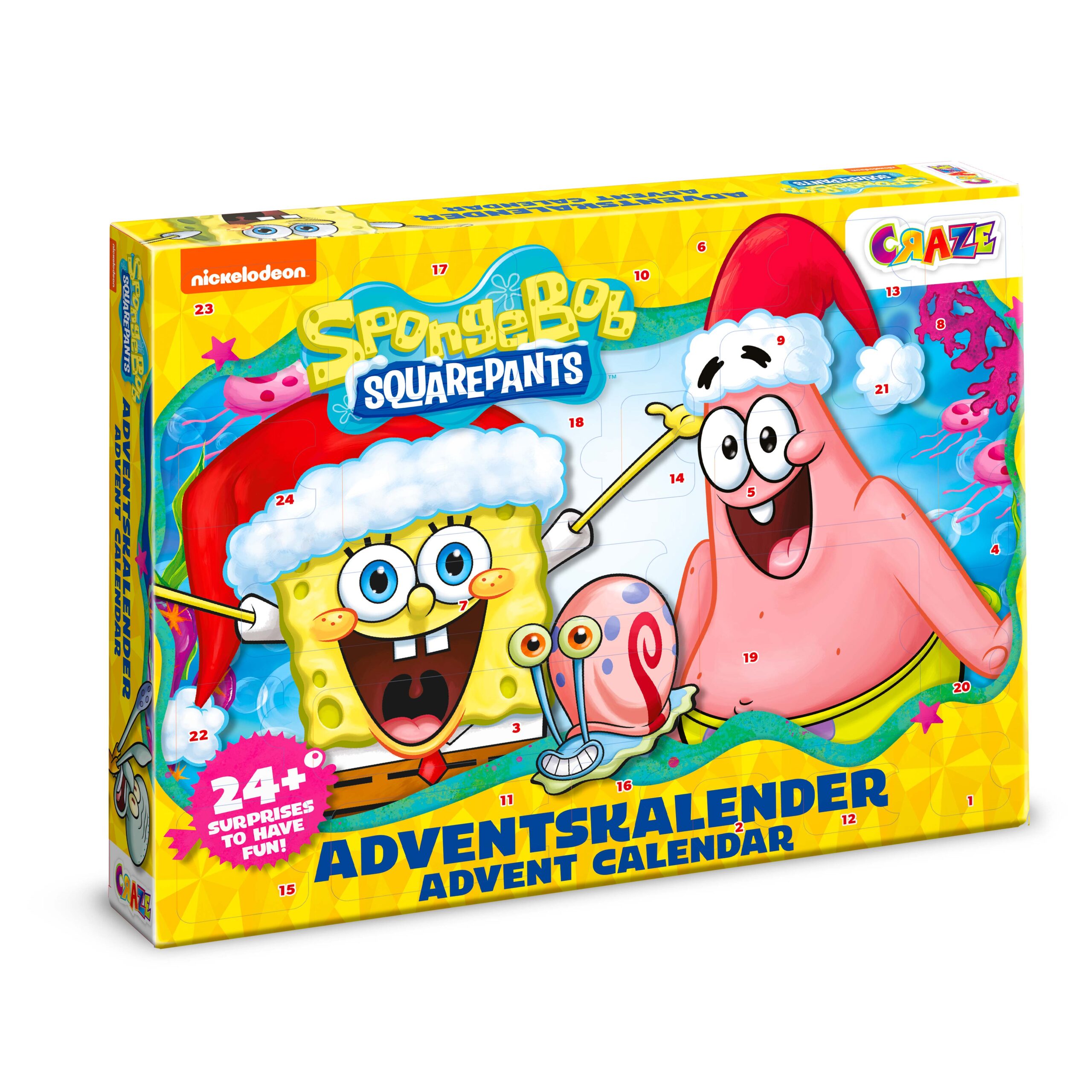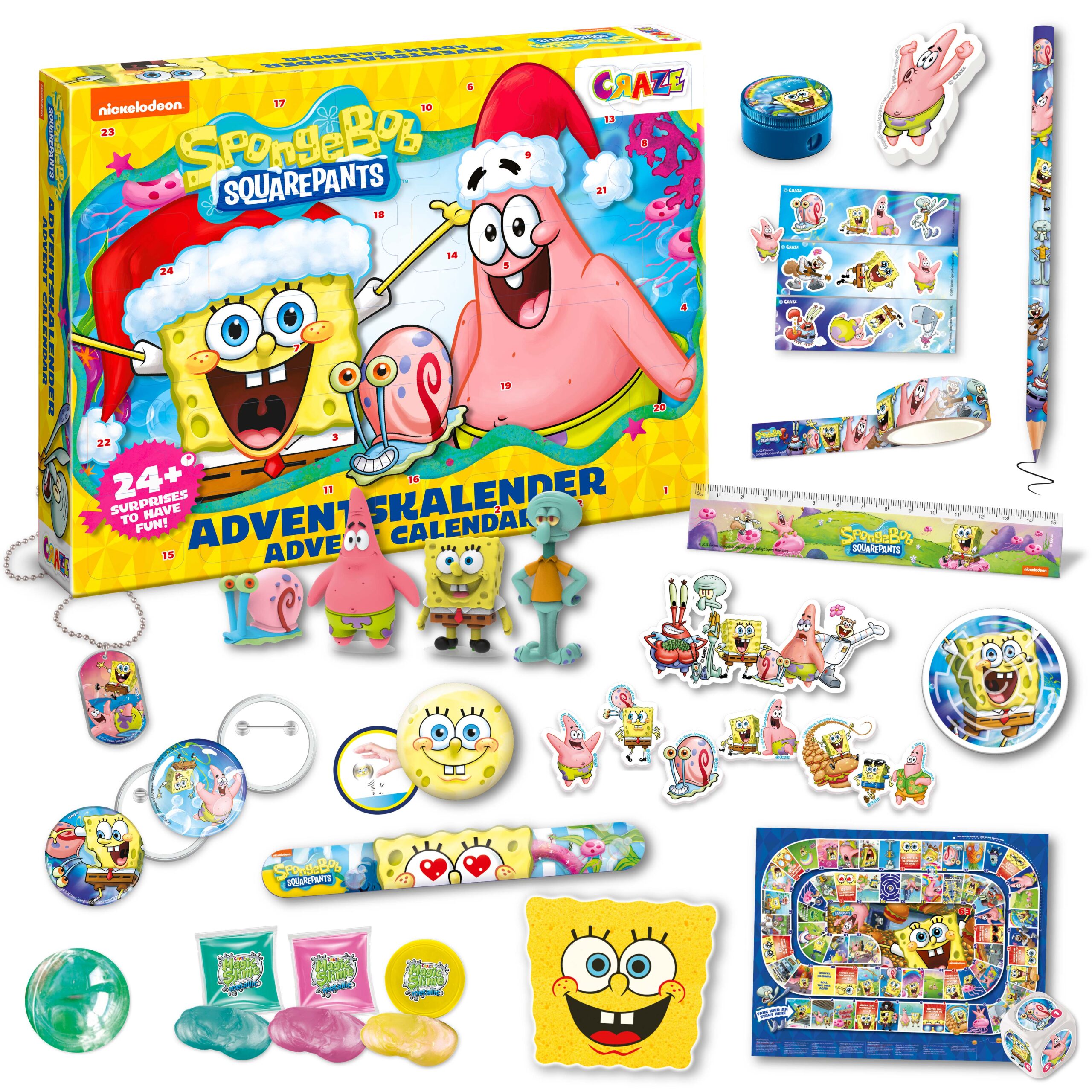 The SpongeBob SquarePants Advent calendar for children from CRAZE contains 24 great surprises. SpongeBob fans can look forward to lots of accessories and toys, including 4 adorable 3D figures, slap-snap bands, Flummis, stickers and cool school supplies.