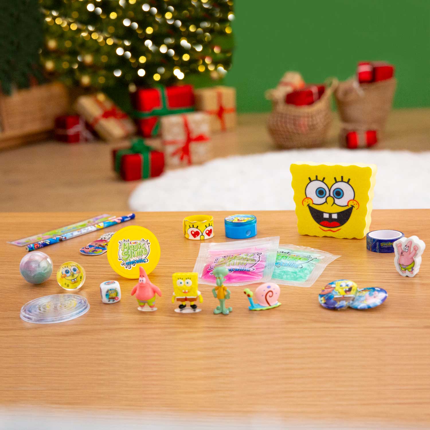 The 24-day advent calendar contains 4 cute SpongeBob figures – SpongeBob SquarePants, Patrick Star, Thaddeus Tentacle and Gary – and a sponge to bring the fun of SpongeBob into the bathtub. A game board and mini maze provide entertainment.