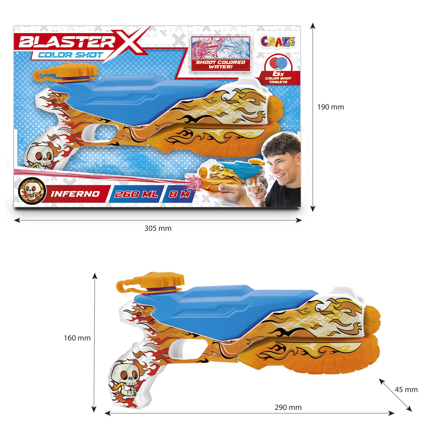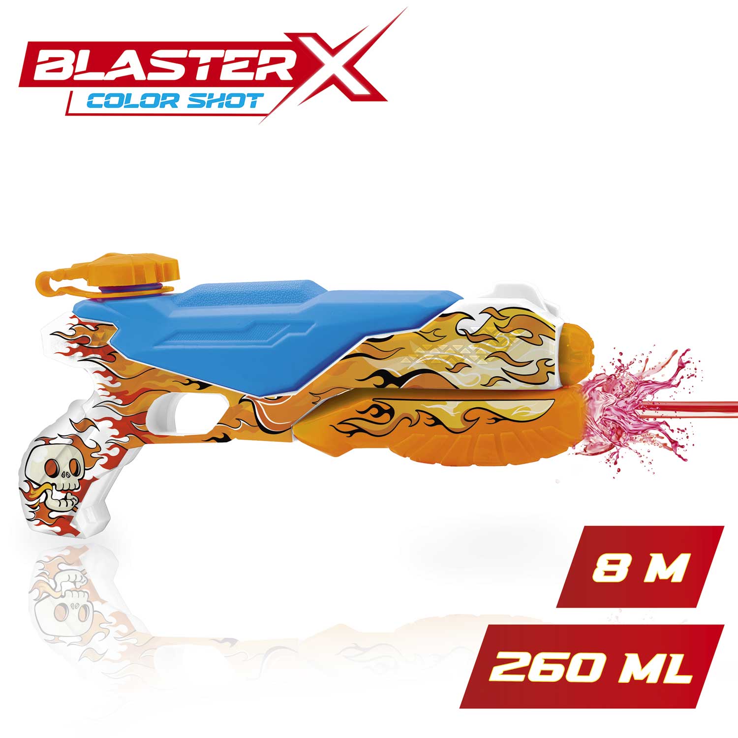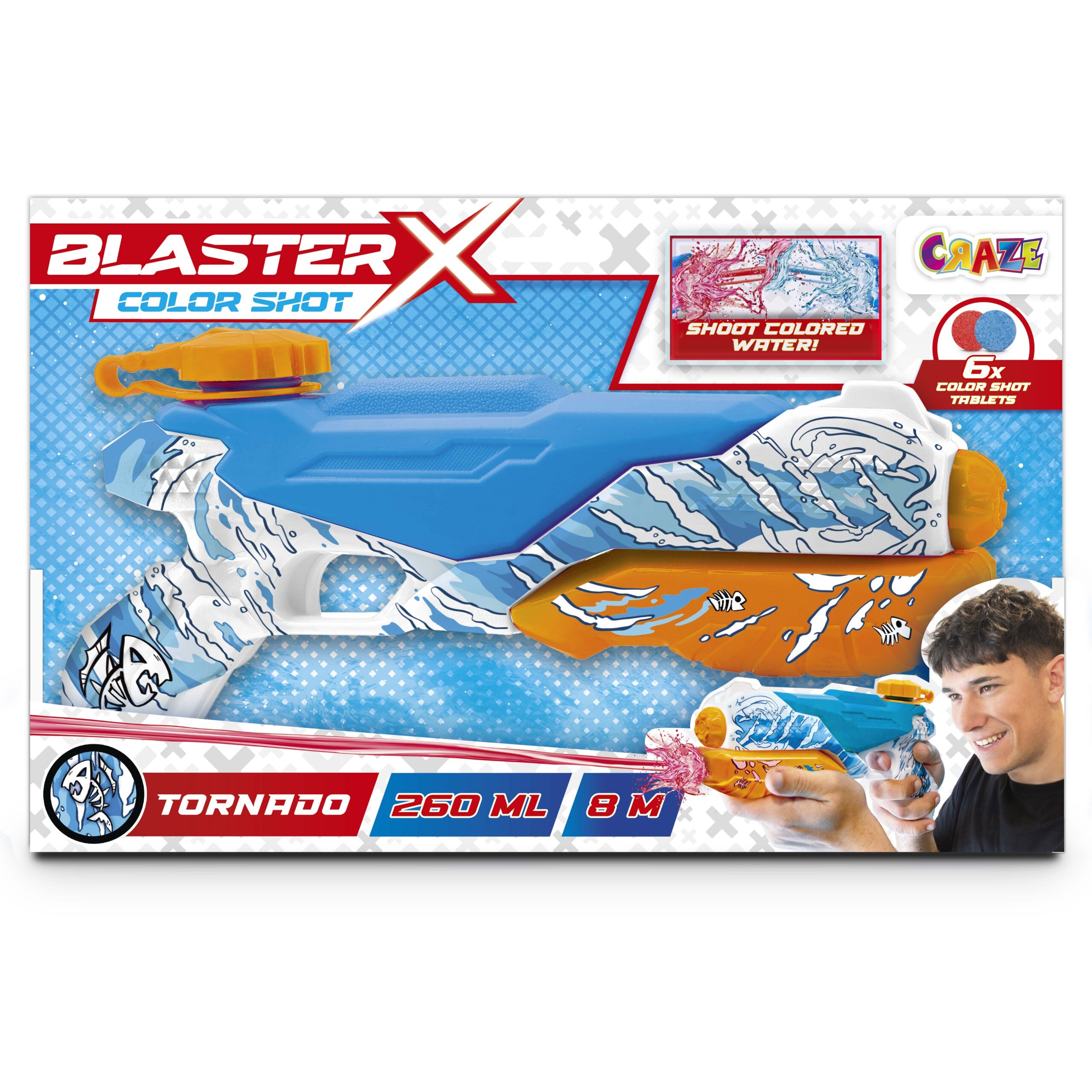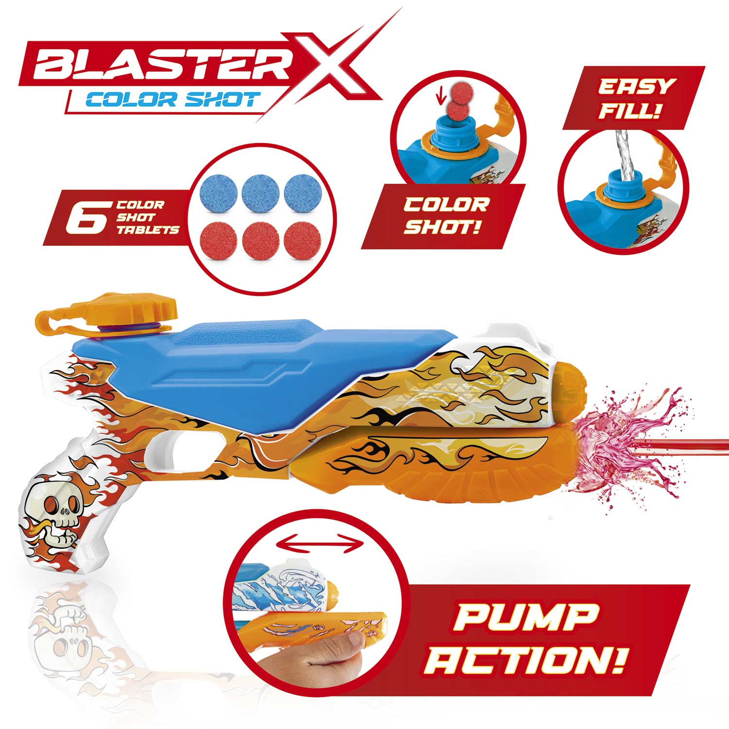 BLASTER-X COLOR SHOT takes water fights to a whole new level. Simply insert the colour tablets into the gun and fill it with water. Watch as they dissolve to create colourful jets of water.