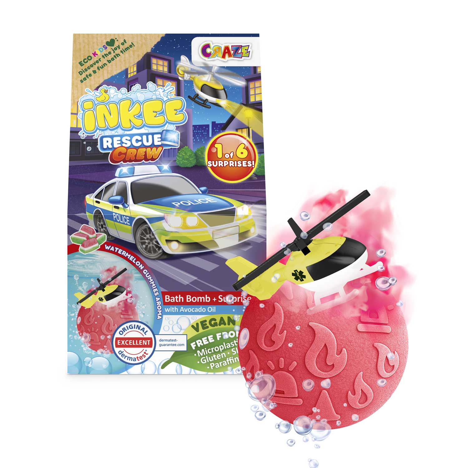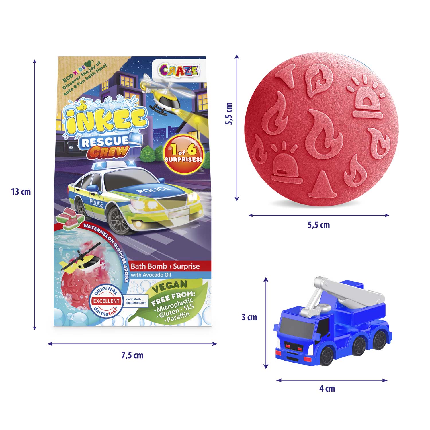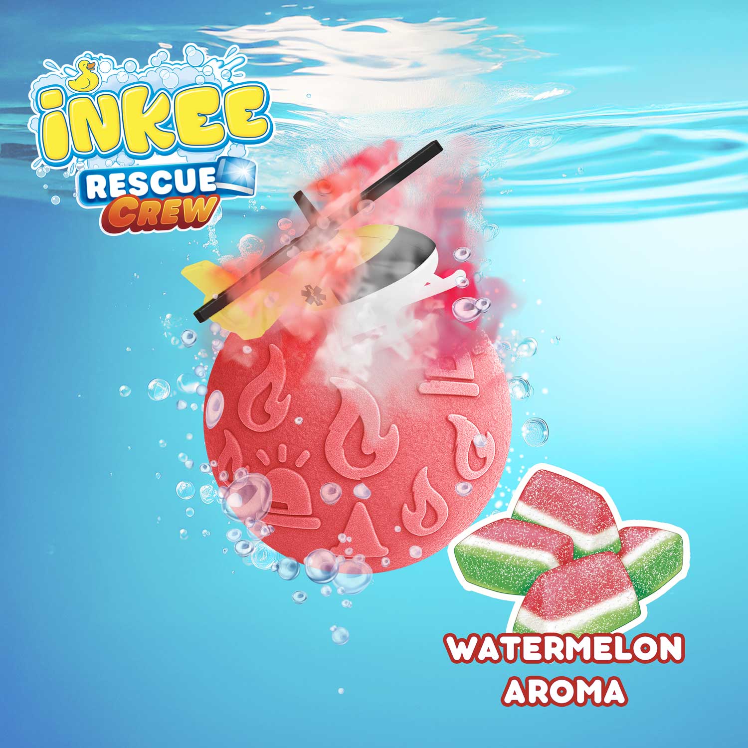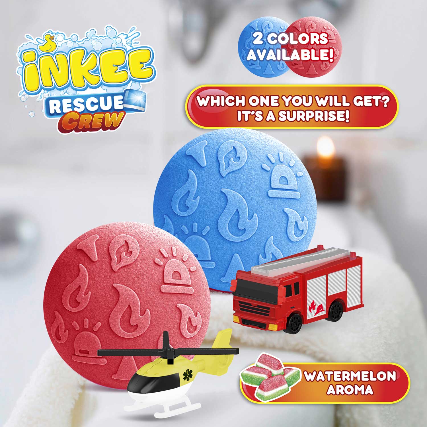The INKEE Surprise Bath Bomb Rescue Crew offers lots of fun for little heroes. As the bath bomb dissolves bubbling in the water, turning the bath water into bright red or blue bubbles and filling the room with a sweet watermelon aroma, the excitement grows to discover which of the 6 collectible mini rescue vehicles is hidden inside.