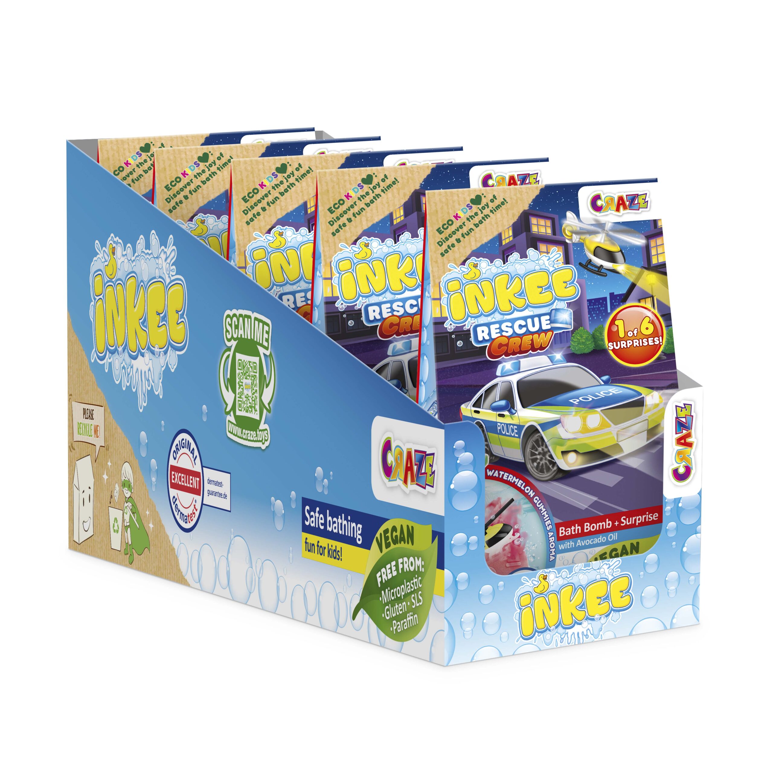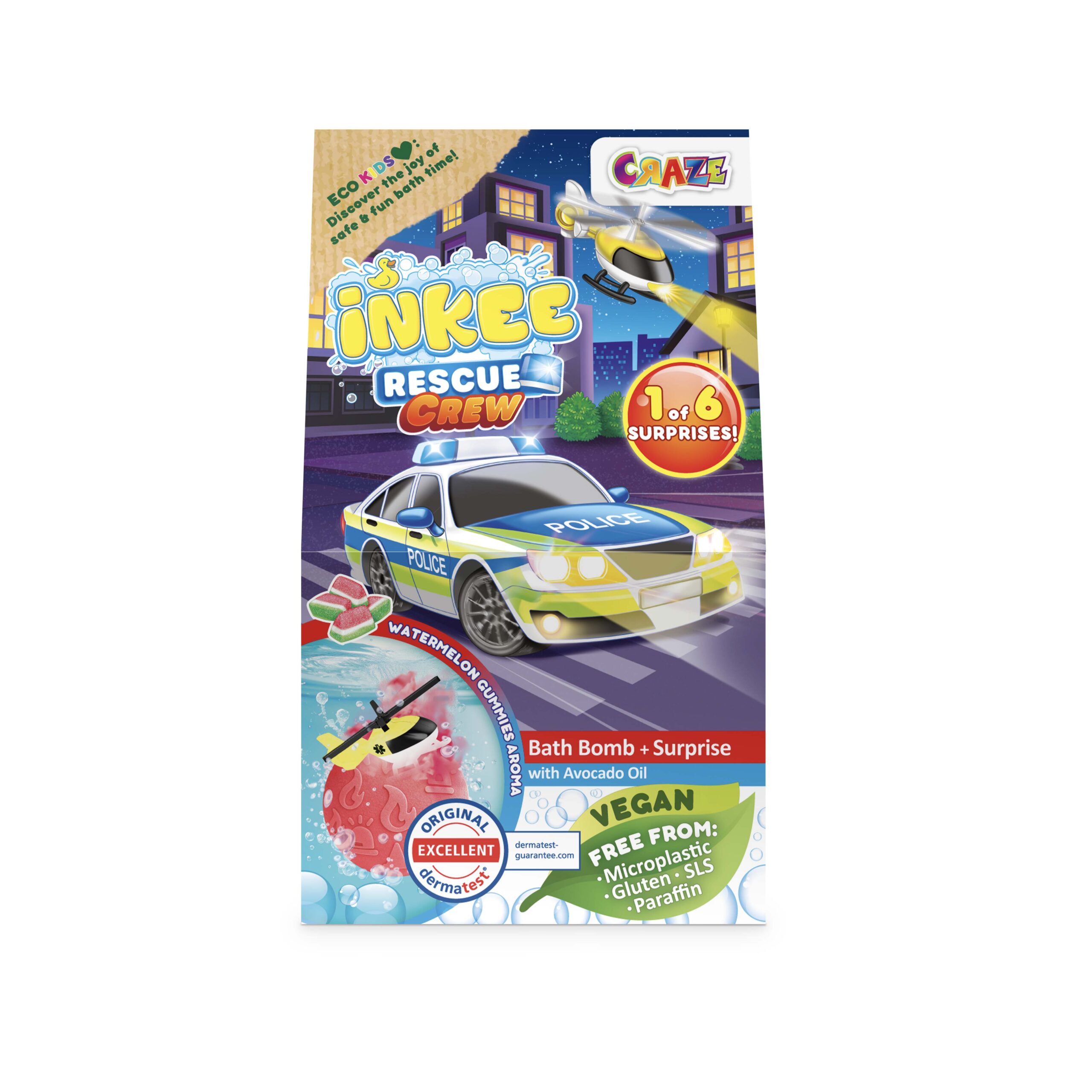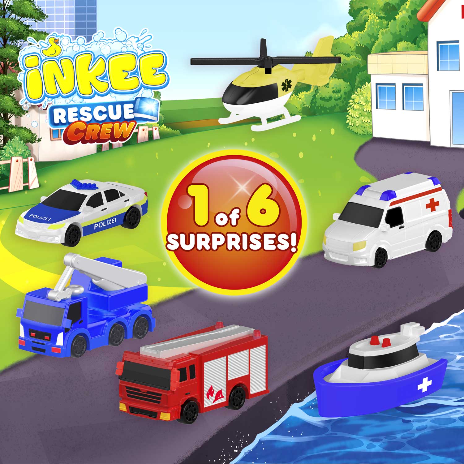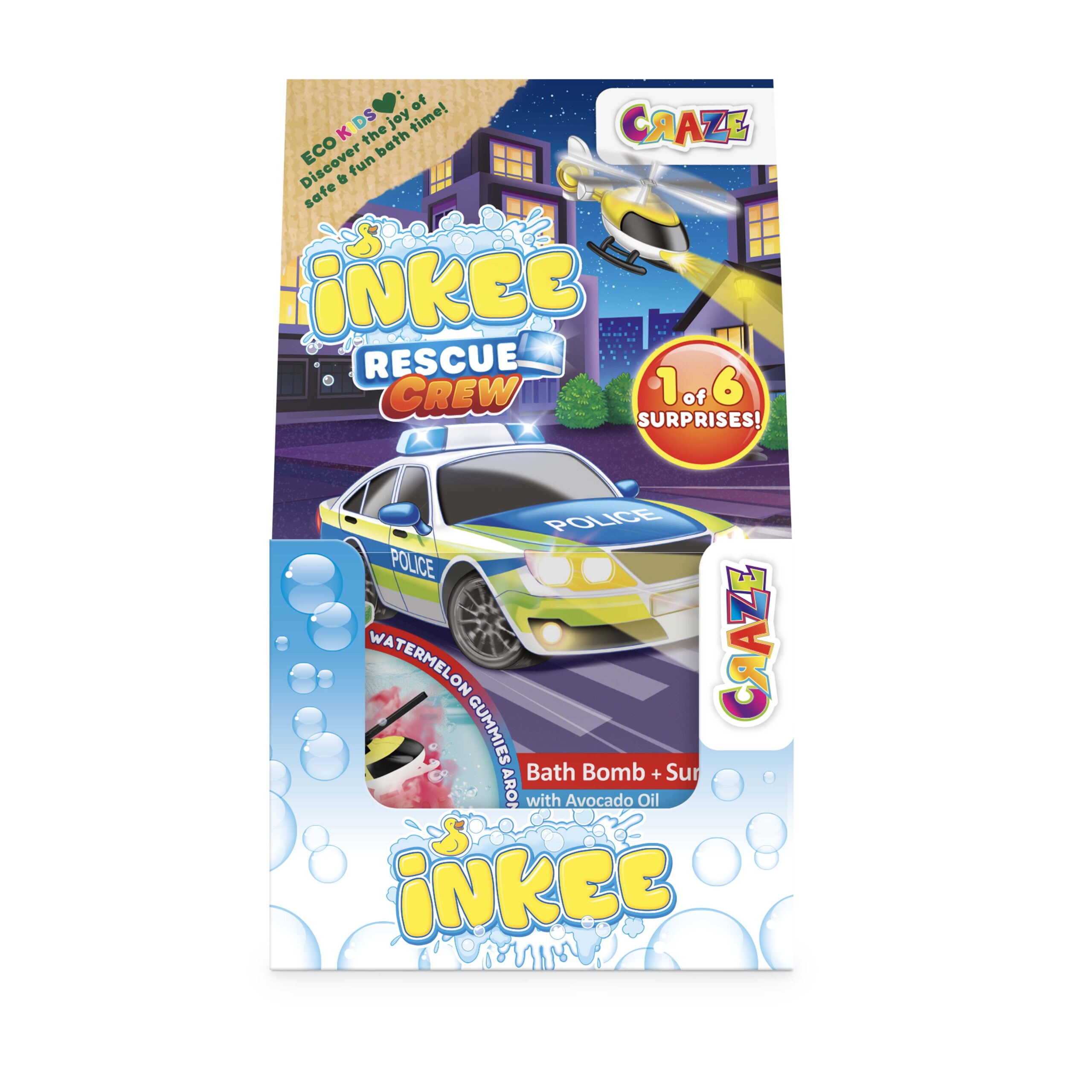 The INKEE Surprise Bath Bomb Rescue Crew offers lots of fun for little heroes. As the bath bomb dissolves bubbling in the water, turning the bath water into bright red or blue bubbles and filling the room with a sweet watermelon aroma, the excitement grows to discover which of the 6 collectible mini rescue vehicles is hidden inside.